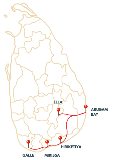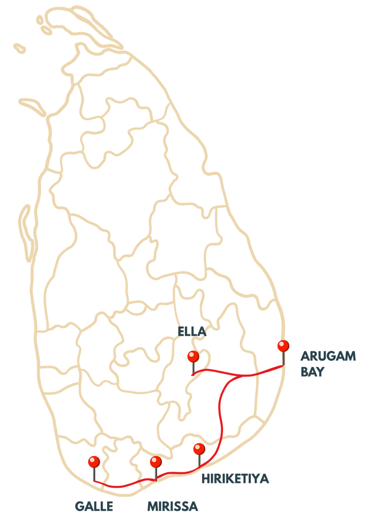 Zelf hebben wij in 11 dagen de onderstaande route gereden. Het hoogtepunt van deze route was toch wel het stuk van Ella naar Arugam Bay en van Arugam Bay naar Hiriketiya. Hier rijd je namelijk dwars door Yala National Park, over een weg die ook wel “Elephant Road” wordt genoemd. En we kwamen er al snel achter waarom: olifanten op de weg! 🐘