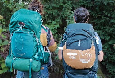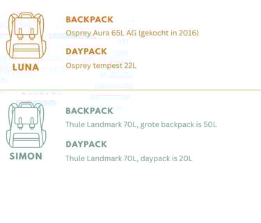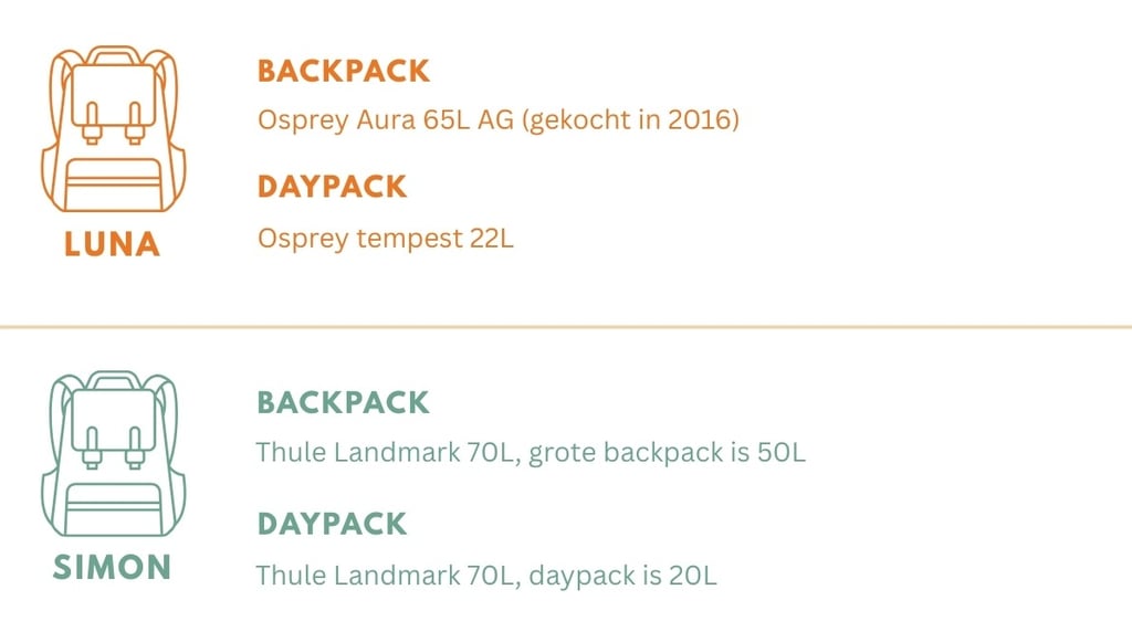 We reizen dus allebei met een grote rugzak én een dagrugzak (daypack). In de onderstaande afbeelding zie je onze keuzes. Simon heeft zelfs een 2-in-1 backpack: de daypack kan aan de grote rugzak worden bevestigd. Handig!