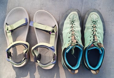 Onze Teva hiking sandalen: tja, fashion is het misschien niet, maar oh wat zitten ze fijn. Dankzij het dikke voetbed en de goede grip kun je er zelfs serieuze wandelingen mee maken. Slippers waren bij eerdere reizen een drama (glibberig, niet stevig), dus dit is een upgrade. Bovendien… misschien maken ze wel een comeback in de modewereld? Ik hoop het in ieder geval.